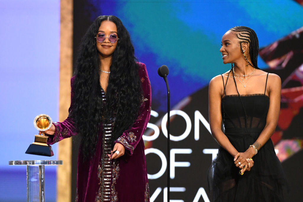 LOS ANGELES, CALIFORNIA – MARCH 14: (L-R) H.E.R. and Tiara Thomas accept the Song of the Year award for ‘I Can’t Breathe’ onstage during the 63rd Annual GRAMMY Awards at Los Angeles Convention Center on March 14, 2021 in Los Angeles, California. (Photo by Kevin Winter/Getty Images for The Recording Academy)